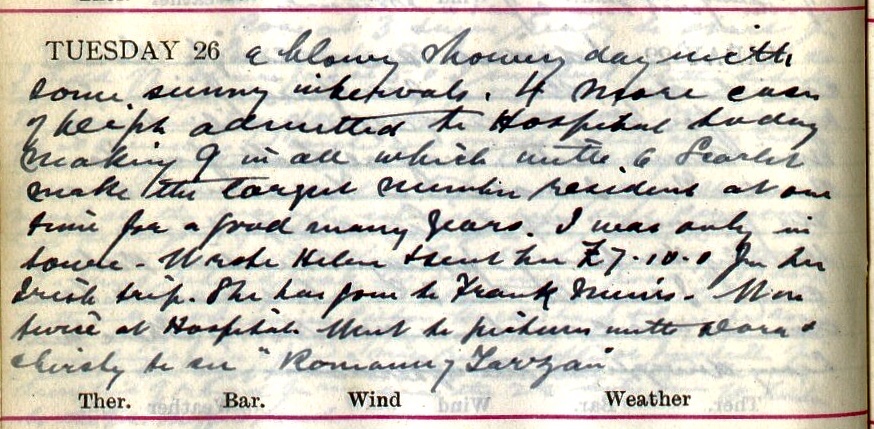 Blowy showery day with some sunny intervals. 4 more cases of Diph[theria] admitted to Hospital1 today making 9 in all which with 6 Scarlet make the largest number resident at one time for a good many years. I was only in town. Wrote Helen2 + sent her £7 10 0 for her Irish trip. She has gone to Frank Muir’s3. Was twice at Hospital. Went to pictures with Dora4 + Christy5 to see “Romance of Tarzan”6.