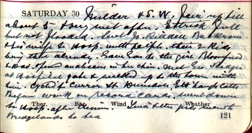Milder + S.W. Fair up till about 5 + very wet after. Ettrick full but not flooded. Sent Jo. Riddell1, Backrow + his wife to Hospital with Diphtheria, their 2 kids being there already. Gave gas to the girl Bloomfield2 + Dav. opened an abscess in her chin. Met Geo. Rodger3 at Hospital gate + walked up to the town with him. Cycled to Curror Street, Dunsdale, Ettrickhaugh Cottages before work on record cards. Went down to Hosp. after dinner. Tina4 + the girls went to Bridgelands5 for tea.