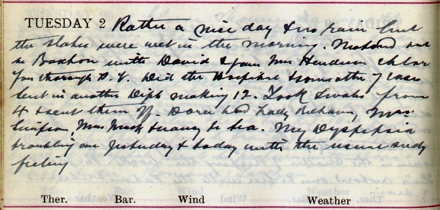 Rather a nice day + no rain but the slates were wet in the morning. Motored out to Buxton with David1 + gave Mrs Henderson2 Chlor[oform] for thorough P.V. Did the Hospital3 + some other 7 cases. Sent in another Diph. making 12. Took swabs from 4 + sent them off. Dora4 had Lady Belhaven5, Mrs Simpson6, Mrs Mack7 + Nancy8 for tea. My Dyspepsia troubling me yesterday + today with the usual seedy feeling.