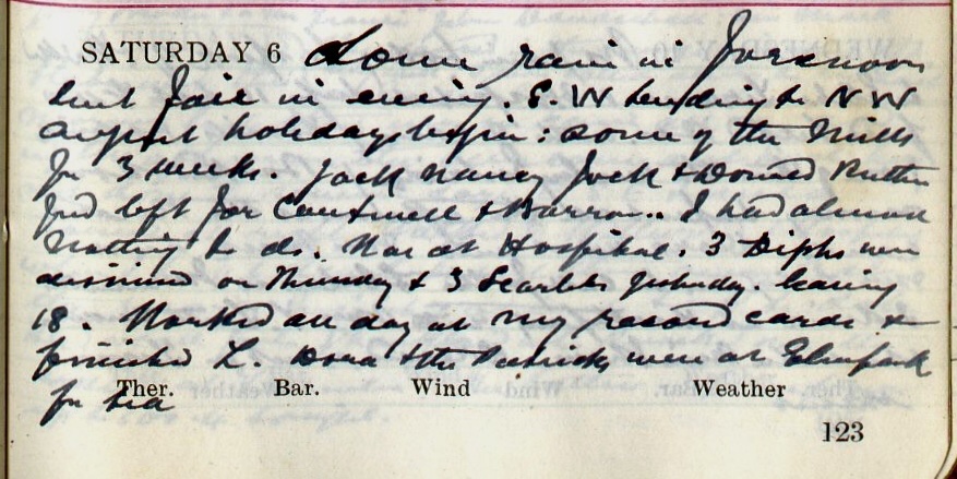 Some rain in forenoon but fair in evening. S.W. tending to N.W. August holidays begin: some of the Mills for 3 weeks1. Jack, Nancy, Jock2 + Donald Rutherford3 left for Cartmell + Barrow4. I had almost nothing to do. Was at Hospital. 3 Diphs were dismissed [?] on Thursday + 3 Scarlets yesterday, leaving 18. Worked all day at my record cards + finished [the letter] L. Dora5 + the Patricks6 were at Elmpark7 for tea.