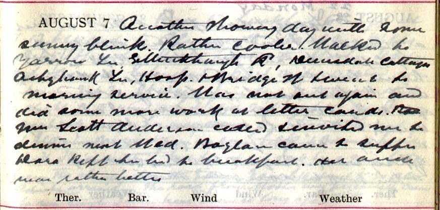 Another showery day with some sunny blinks. Rather cooler. Walked to Yarrow Terrace, Ettrickhaugh Road, Dunsdale Cottages, Ashybank Terrace, Hospital + Bridge Street + went to morning service. Was not out again and did some more work at letter cards. Mrs Scott Anderson1 called + invited me to dinner next Wed. Boylan2 came to supper. Dora3 kept her bed to breakfast. Her ankle was rather better.