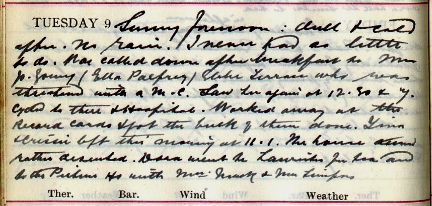 Sunny forenoon: dull + cold after. No rain. I never had so little to do. Was called down after breakfast to Mrs Jo. Young (Ella Palfrey1), Glebe Terrace who was threatened with a M.C.2 Saw her again at 12.30 + 7. Cycled to these + Hospital. Worked away at the record cards + got the bulk of them done. Tina + Chrissie3 left this evening at 11.1. The house felt rather deserted. Dora4 went to Lauriston5 for tea and to the Picture Ho. with Mrs Mack6 + Mrs Simpson7.