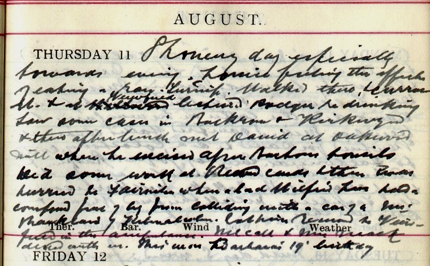 Showery day especially towards evening. Louise1 feeling the effects of eating a raw turnip. Walked there2, + Curror Street + at Wellwood Viewfield lectured Rodger3 re drinking. Saw some cases in Backrow + Kirkwynd + then after lunch met David4 at Oakwood Mill where he excised Agnes Barton’s tonsils5. Did some work at Record Cards + then was hurried to Fairnilea where a lad Wilfred Lees6 had a compound fracture of leg from colliding with a car of a Mrs Shankland of Kilmalcolm7. Got him removed to Viewfield in the ambulance. McCall8 + Mrs Mack9 dined with me. This was Barbara’s 19th birthday10.