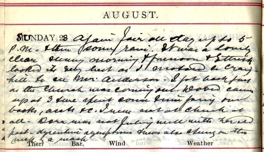 Again fair all day up to 5 p.m. + then some rain. It was a lovely clear sunny morning + forenoon + Ettrick looked its very best as I motored to Craighill to see Mrs Anderson1. I got back just as the Church was coming out. David2 came up at 3 + we spent some time going over books, accounts +c. I was not at church at all. Dora3 was not feeling well with her old post-dysenteric symptoms + was also stung on the neck by a wasp.