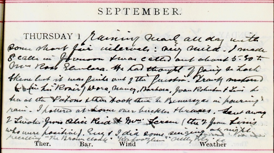 Raining nearly all day with some short fair intervals: very mild. I made 8 calls in forenoon + was called out about 5.30 to Mrs Ross1, Glenlora. We had thought of going to Loch Skene but it was quite out of the question. Frank2 motored (in his …3) Dora, Nancy, Barbara4, Joan Robertson5 + Tim to tea at the Patons6 + then took them to Bemersyde in pouring rain. I pottered at home over buckles + braces. Sent away 2 swabs from Alice Reid7 + Mrs Screen8 (the 2 from Tinnis [?] who were positive). Guy9 + I did some singing at night recalling “The Brown Cloak”10, …11 “Nelly Bly”12 &c.