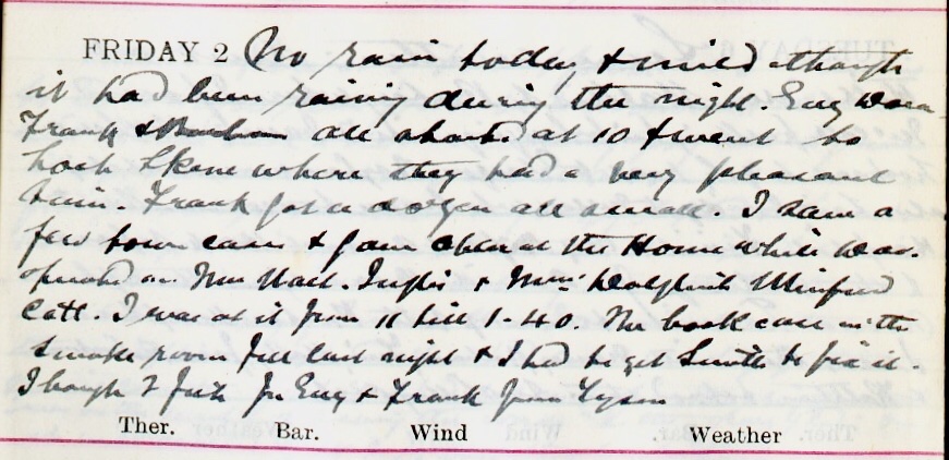 No rain today + mild, though it had been raining during the night. Guy1, Dora2, Frank3 + Barbara4 all started at 10 + went to Loch Skene5 where they had a very pleasant time. Frank got a dozen all small. I saw a few town cases + gave Chlor[oform] at the Home while Dav.6 operated on Mrs Walt. Inglis7 + Mrs Dalgleish8, Whinfield Cottage. I was at it from 11 till 1.40. The book case in the smoke room fell last night + I had to get Smith9 to fix it. I bought 2 fish for Guy + Frank from Tyson10.