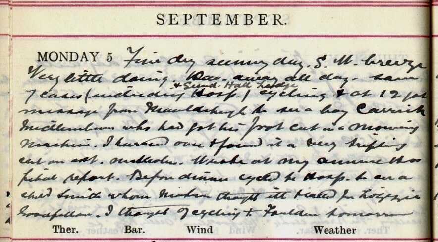 Fair dry sunny day. S.W. breeze. Very little doing. Dav.1 away all day. Saw 7 cases (including Hospital + Sunderland Hall Lodge) cycling + at 12 got message from Mauldsheugh2 to see a boy Carrick, Midlemburn3 who had got his foot cut in a mowing machine. I hurried over + found it a very trifling cut on ant. malleolus4. Wrote at my annual Hospital report. Before dinner cycled to Hosp. to see a child Smith5 whom Matron thought ill + called for Lizzie Goodfellow6. I thought of cycling to Foulden tomorrow.