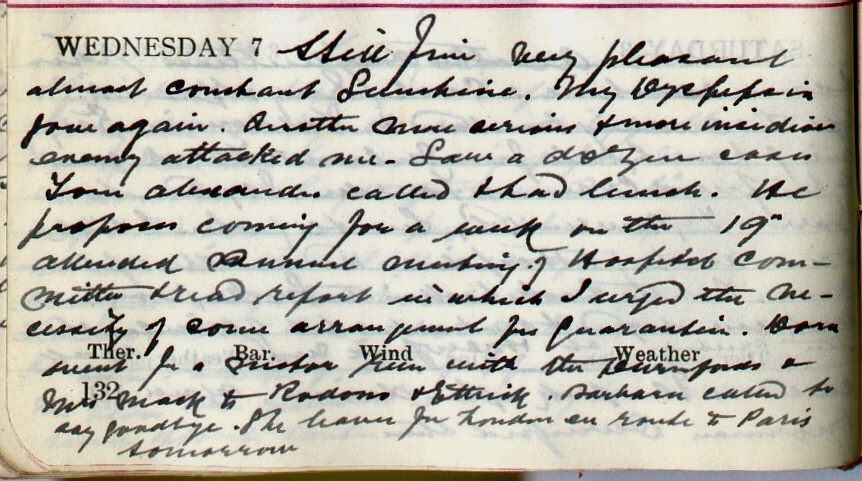 Still fine very pleasant almost constant sunshine. My Dyspepsia gone again. Another more serious + more insidious enemy attacked me – saw a dozen cases. Tom Alexander1 called + had lunch. He proposes coming for a week on the 19th. Attended Annual meeting of Hospital Committee + read report in which I urged the necessity of some arrangement for quarantine. Dora2 went for a motor run with the Durnfords3 + Mrs Mack4 to Rodono + Ettrick. Barbara5 called to say goodbye. She leaves for London en route for Paris tomorrow.