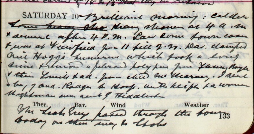 Brilliant morning: colder. Some heavy sho Heavy shower at 4 a.m. + several after 4 p.m. Saw some town cases + I was at Viewfield from 11 to 2.20. Dav.1 clamped Neil Hogg’s2 humerus which took a long time + removed a fibroid polypus from Fanny Boyle3 + then Tonsils + ad[enoids]. from child McKearney4. I sent a boy of And. Rodger5 to Hosp. with Diph. + a woman Wightman6 was sent by Hiddleston7.