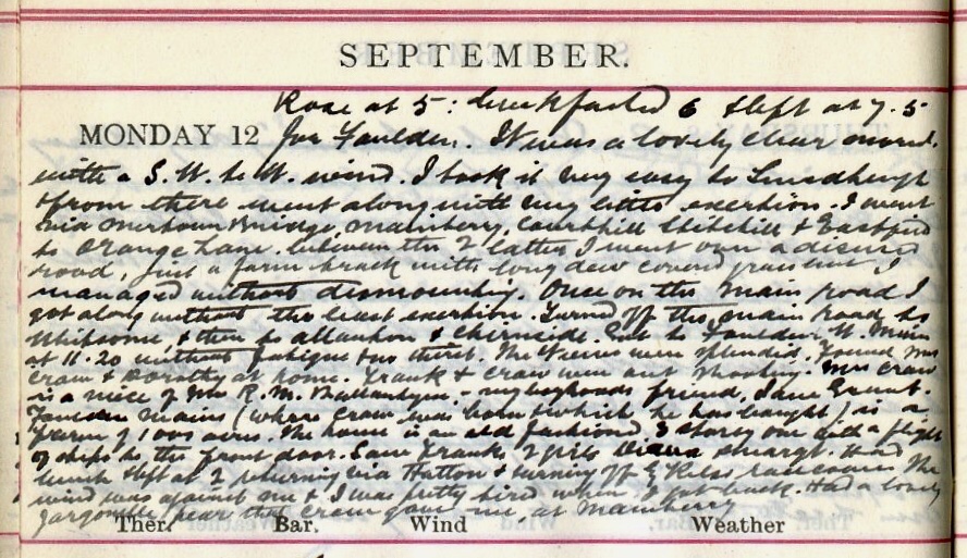 Rose at 5: breakfasted 6 + left at 7.5 for Foulden1. It was a lovely clear … with a S.W. to W. wind. I took it very easy to Smedheugh2 + from there went along with very little exertion. I went via Mertoun Bridge, Mainberry, Courthill, Stitchill + Eastfield to Orange Lane3. Between the 2 latter I went over a disused road, just a farm track with long dew covered grass4 but I managed without dismounting. Once on the main road I got along without the least exertion. Turned off the main road to Whitsome + then to Allanton + Chirnside5. Got to Foulden West Mains6 at 11.20 without fatigue + no thirst. The views were splendid. Found Mrs Craw7 + Dorothy8 at home. Frank9 + Craw10 were out shooting. Mrs Craw is a niece of Mr R M Ballantyne11 + my boyhood’s friend Jane Grant12. Foulden Mains (where Craw was born + which he has bought) is a farm of 1,000 acres. The house is an old fashioned 3 storey one with a flight of steps to the front door. Saw Frank’s two girls Diana + Margaret13. Had lunch + left at 2, returning via Hutton + turning off by Kelso racecourse. The wind was against me + I was pretty tired when I got back. Had a lovely Jargonelle pear14 that Craw gave me, at Mainberry.