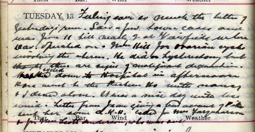 Feeling ever so much better for yesterday’s run. Saw a few town cases and was from 11 till nearly 2 at Viewfield where Dav.1 operated on Mrs Hill2 for ovarian cysts involving the uterus. He did a hysterectomy but thought there are signs of malignant degeneration. Walked cycled down to Hospital in afternoon. Dora3 went to the Picture Ho. with Nancy4 + I dined alone. It was a nice day with less wind. Letter from Jean5 giving a bad account of Pike6. Sent her some [? A.K.H]. Called for Mrs Farquharson7 + for Mrs Scott8 Anderson1, who was out.