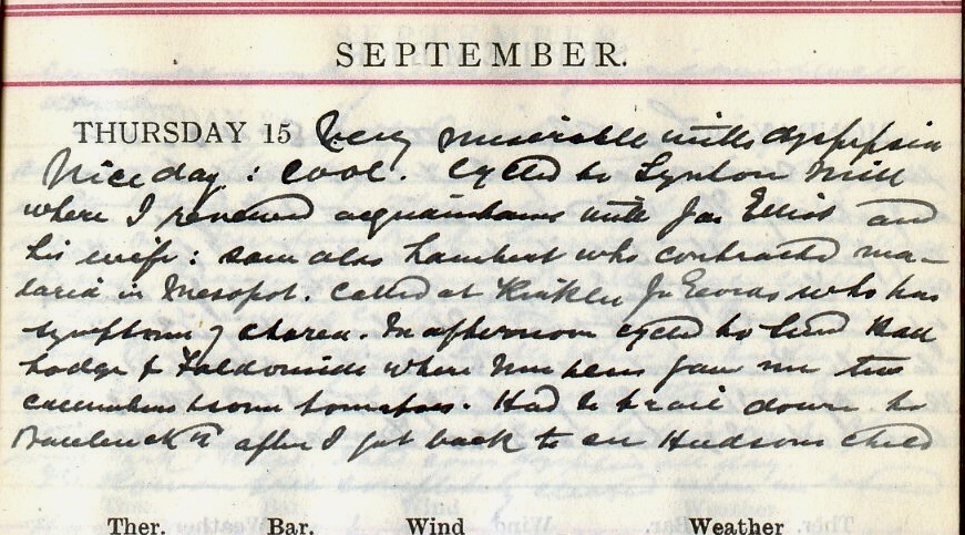 Very miserable with dyspepsia. Nice day: cool. Cycled to Synton Mill where I renewed acquaintance with Jas. Elliot1 + his wife: saw also Lambert2 who contracted Malaria in Mesopot[amia]. Called at Kirklea for Geordo3 who has symptoms of Chorea4. In afternoon cycled to Sunderland Hall Lodge + Faldonside where Mrs Dees5 gave me two cucumbers + some tomatoes. Had to trail down to Buccleuch Road after I got back to see Henderson’s child6.