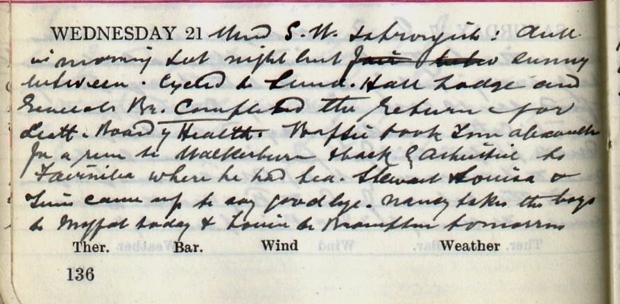 Wind S.W. + strongish: dull in the morning + at night but fair betw sunny in between. Cycled to Sunderland Hall Lodge and General’s Bridge. Completed the returns for Scott. Board of Health1. Baptie2 took Tom Alexander3 for a run to Walkerburn + back by Ashiestiel4 to Fairnilee5 where he had tea. Stewart, Louisa + Tim6 came up to say goodbye. Nancy takes the boys to Moffat today + Louisa to Brampton tomorrow7.