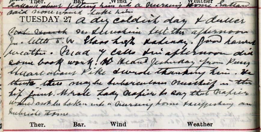 A dry coldish day + duller not much no sunshine + in the afternoon just a little S.W. Glass high + steady. Good harvest weather. Made 7 calls + in afternoon did some book work. Heard yesterday from Pussy Stewart1 about Pike2 + wrote thanking him. He thinks there may be tuberculous mischief in the hip joint. Wrote Lady Napier3 to say that Napier4 would not be taken into a nursing home + suggesting an Inebriates Home.