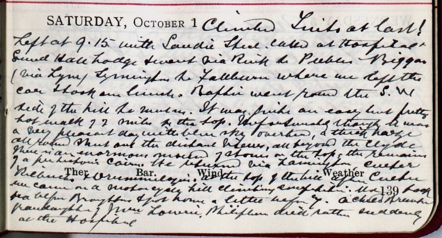 Climbed Tinto1 at last! Left at 9.15 with Sandie Steel2. Called at Hospital, Sunderland Hall Lodge + went via Rink to Peebles, Biggar (via Lyme), Symington to Fallburn3 where we left the car + took our lunch. Baptie4 went round the S.W. side of the hill to meet us. It was quite an easy but pretty hot walk of 2 miles to the top. Unfortunately though it was a very pleasant day, with blue sky overhead, a thick haze all round shut out the distant views, all beyond the Clyde. There is an enormous mound of stones on top, the remains of a prehistoric cairn5. We returned via Lamington, Culter, Kilbucho + Drumelzier6. At the top of the hill after Culter we came on a motor cycle hill climbing competition7. We took tea after Broughton + got home a little before 7. A child Brunton8, granddaughter of Mrs Lowrie [sic] of Philipburn, died rather suddenly at the Hospital.