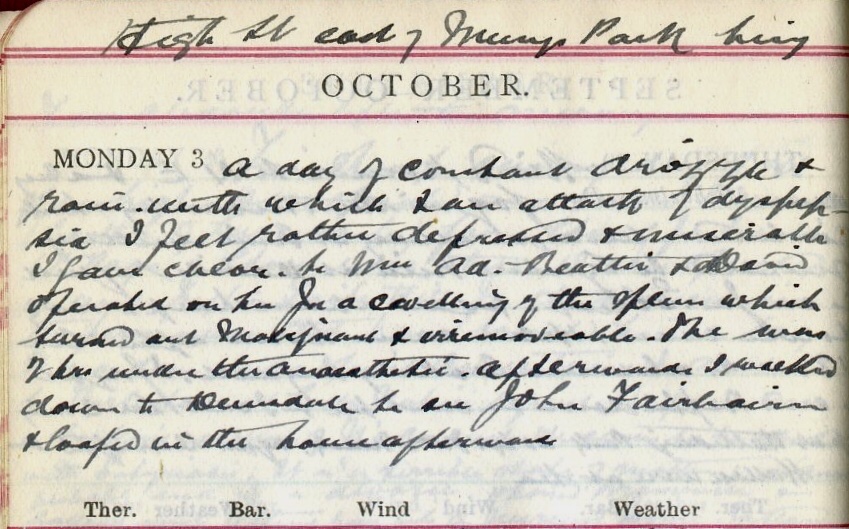 A day of constant drizzle + rain with which + an attack of dyspepsia I feel rather depressed + miserable. I gave Chlor[ofrom] to Mrs Adam Beattie1 + David2 operated on her for a swelling of the spleen which turned out malignant + inoperable. She was 2 hours under the anaesthetic. Afterwards I walked down to Dunsdale to see John Fairbairn3 + loafed in the house afterwards.