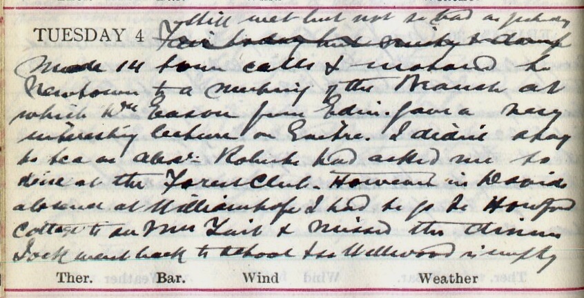 Still wet but not so bad as yesterday. Fair today but misty + damp. Made 14 town calls + motored to Newtown for a meeting of the Branch1 at which Dr Easson2 gave a very interesting lecture on Goitre3. I didn’t stay to tea as Alexr Roberts4 had asked me to dinner at the Forest Club5. However in David’s6 absence at Williamhope7 I had to go to Howford Cottage to see Mrs Tait8 + missed the dinner. Jock9 went back to school + so Wellwood10 is empty.