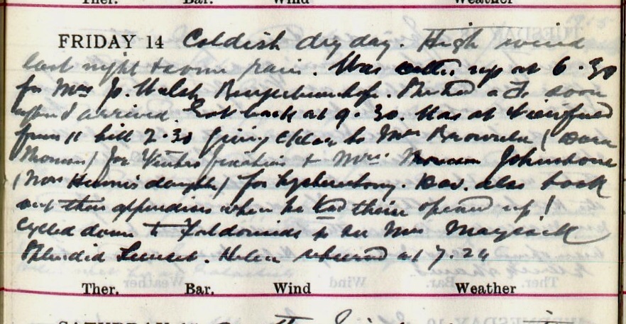 Coldish dry day. High wind at night + some rain. Was called up at 6.30 for Mrs Jo. Welsh1, Bengerburnhope. She had a d. [daughter] soon after I arrived2. Got back at 9.30. Was at Viewfield from 11 to 2.30 giving Chlor[oform] to Mrs Brownlee3 (Dora Thomson) for [illegible] fixations + Mrs Brown Johnstone4 (Mrs Hume‘s daughter) for hysterectomy. Dav.5 also took out their appendices while he had them [?] opened up! Cycled down to Lower Faldonside to see Mrs Maycock6. Splendid sunset. Helen7 returned at 7.24.