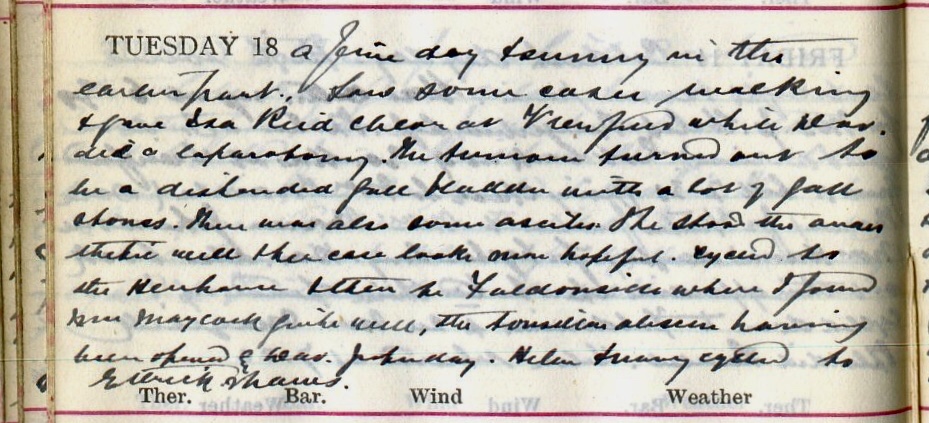 A fine day + sunny in the early part. Saw some cases walking + gave Isa Reid1 Chlor[oform] at Viewfield while Dav.2 did a laparotomy. The tumour turned out to be a distended full bladder with a lot of gall stones. There was also some Ascites3. She stood the anaesthetic well + her case looks more hopeful. Cycled to the Henhouse4 + then to Faldonside where I found Mrs Maycock5 quite well, the tonsillar abscess having been opened by Dav. yesterday. Helen + Nancy6 cycled to Ettrick Shaws7.