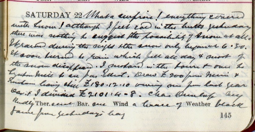 What a surprise! Everything covered with snow! I felt cold in the butts1 yesterday there was nothing to suggest the possibility of snow at all. It rained during the night + the snow only began at 6.30. It soon turned to rain which fell all day + most of the snow disappeared. I motored in the town + over to Synton Mill to see James Elliot2 . Drew £200 from Muir & Graham3 being still £180. 12. 10 still owing me from last year. Dav.4 + I divided £2101: 4 : 8. Chas Dunlop5 very kindly sent me a brace of Black …6 from yesterday’s bag.