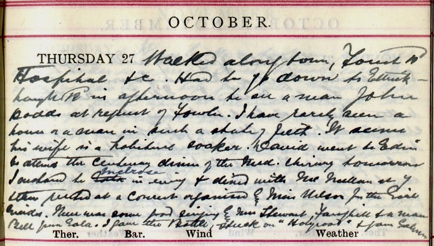 Walked along along town, Forest Road, Hospital +c. Had to go down to Ettrickhaugh Road to see a man John Dodds1 at request of Fowler2. I have rarely seen a house or a man in such a state of filth. It seems his wife is a habitual soaker3. David4 went to Edin. to attend the Centenary dinner of the Medical Chirug.5 tomorrow. I motored to Melrose + dined with McMillan6 at 7 + then recited at a Concert organised by Miss Wilson7 for the Girl Guides. There was some good singing by Miss Stewart8, Faughill [?] + a man Bell9 from Gala. I gave the Bottle, stuck on “Holyrood” + gave Salmon10.