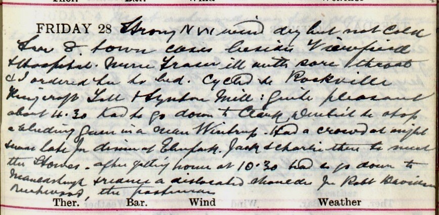 Strong NW wind dry but not cold. Saw 8 town cases besides Viewfield + Hospital. Nurse Fraser1 ill with sore throat + I ordered her to bed. Cycled to Rockville2, Kingcroft Toll3 + Synton Mill: quite pleasant. About 4.30 had to go down to Clark4, dentist, to stop a bleeding gum in a man Wintrup5. Had a crowd at night + was later for dinner at Elmpark6. Jack7 + Charlie8 there to meet the Stowes9. After getting home at 10.30 had to go down to Mauldsheugh10 + reduce a dislocated shoulder for Robt. Davidson11, Beechwood, the postman.