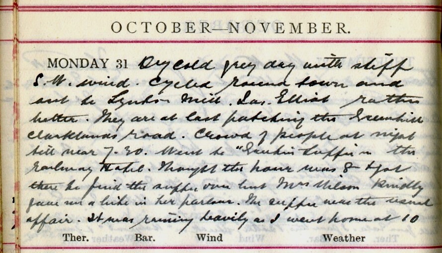 Dry cold grey day with stiff S.W. wind. Cycled round town + out to Synton Mill. Jas. Elliot1 rather better. They are at last patching the Greenhill to Clarklands road2. Crowds of people at night till near 7.30. Went to “Greetin’ Supper”3 in the Railway Hotel4. Thought the hour was 8 + got there to find the supper over but Mrs Wilson5 kindly gave me a bite in her parlour. The supper was the usual affair. It was raining heavily as I went home at 10.