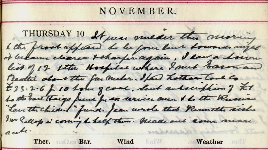 It was milder this morning + the frost appeared to be gone but towards night it became clearer + sharper again. I saw a town list of 12 + the Hospital where I met Eason1 & Beattie about the gas meter. I paid Lothian Coal Co. £233. 2. 6 for 10 tons of coal. Sent subscription of £1 to the Earl Haig’s Fund2 for ex-service men + to the Russian “Save the Children” fund3. Jean4 wrote that Kenneth’s5 sister Mrs Gallop6 is coming to help there. Made out some more accounts.