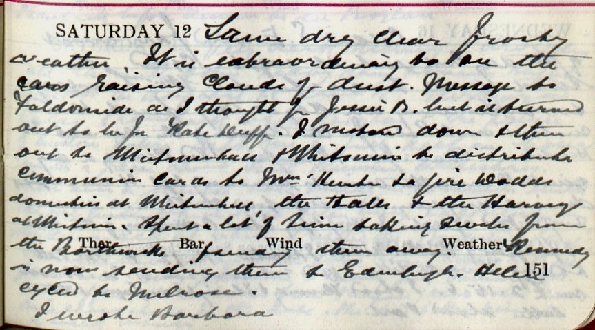 Same dry clear frosty weather. It was extraordinary to see the cars [?] raising clouds of dust. Message to Faldonside as I thought for Jessie B1. but it turned out to be for Kate Duff2. I motored down + then out to Whitmuirhall + Whitmuir to distribute communion cards to Mrs Hunter3 + a girl Dodds4 domestic at Whitmuirhall, the Halls5 + the Harvey’s6 at Whitmuir. Spent a lot of time taking swabs from the Borthwick family7 + sending them away. Kennedy8 is now sending them to Edinburgh. Helen9 cycled to Melrose. I wrote Barbara10.