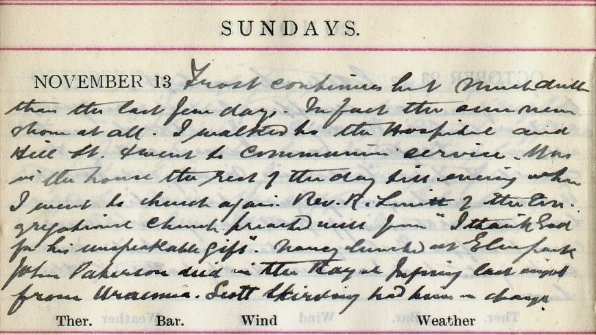 Frost continues but much duller than the last few days. In fact the sun never shone at all. I walked to the Hospital + Hill Street + went to communion service. I was in the house the rest of the day till evening when I went to church again. Rev. R Smith1 of the Congregational Church preached well on “I thank God for his unspeakable gift”2. Nancy3 lunched at Elmpark4. John Paterson5 died in the Royal Infirmary last night from Uraemia. Scott Skirving6 had been in charge.