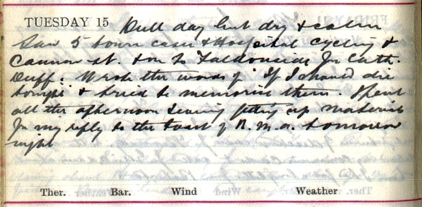 Dull day but dry + calm. Saw 5 town cases + Hospital cycling + Cannon Street + on to Faldonside for Cath Duff1. Wrote the words of “If I Should Die Tonight”2 + tried to memorise them. Spent all the afternoon + evening getting up material for my reply to the toast of B.M.A. tomorrow night3.