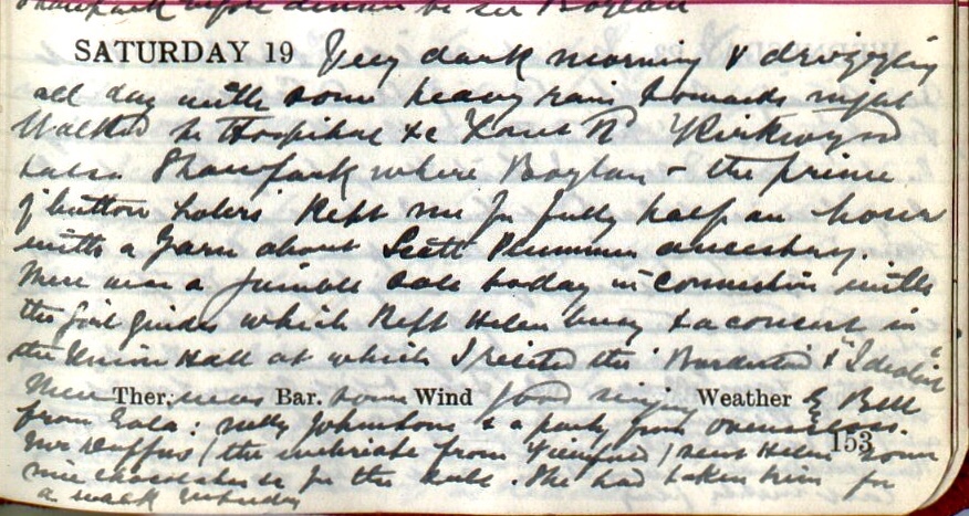 Very dark morning + drizzling all day with some heavy rain towards night. Walked to Hospital +c Forest Road, Kirkwynd + also Shawpark where Boylan1 – the prince of button holers – kept me fully half an hour with a yarn about Scott Plummer’s2 ancestry. There was a jumble sale today in connection with the Girl Guides which kept Helen3 busy + a concert in the Union Hall at which I recited the ‘Borderland’4 + ‘Idealist’5. There was some good singing by Bell of Gala6. Mr Duffus7 (the inebriate from Viewfield) sent Helen some nice chocolates +c for the sale. She had taken him for a walk yesterday.