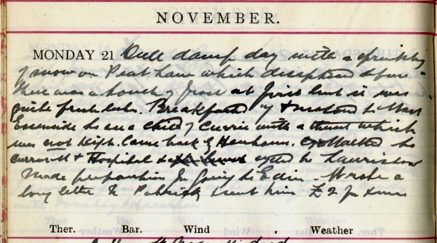 Dull damp day with a sprinkling fog snow on Peat Law1 which disappeared after. There was a touch of frost at first but it was quite fresh later. Breakfasted 7 [sic] + motored to West Essenside2 to see a child of Currie3 with a throat which was not Diph.4 Came back by Henhouse5. Cyc Walked to Curror Street + Hospital6 + after lunch cycled to Lauriston7. Made preparations for going to Edin.8 Wrote a long letter to Patrick9 + sent him £2 for Xmas.