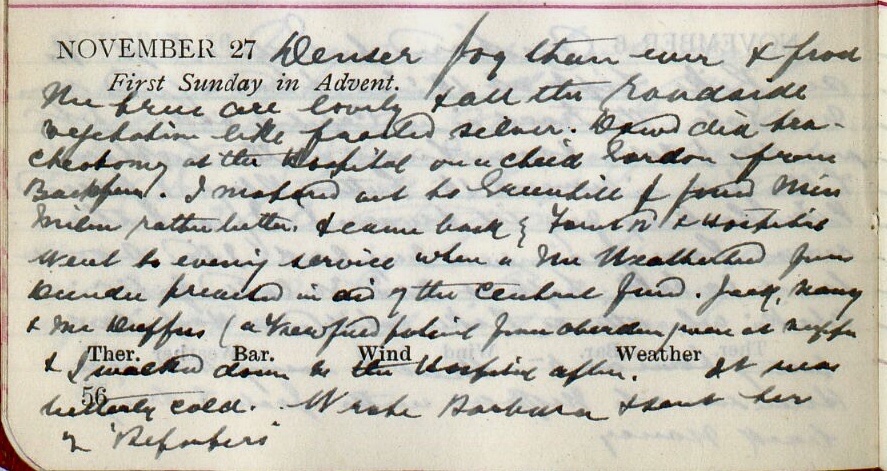 Denser fog than ever + frost. All the trees are lovely + all the roadside vegetation like frosted silver. David1 did tracheotomy at the Hospital on a child Gordon from Backfeus2. I motored out to Greenhill + found Miss Milne3 rather better + came back by Forest Road + Hospital. Went to evening service where a Mr Weatherhead4 from Dundee preached in aid of the Central Fund5. Jack, Nancy6 + Mr Duffus7 (a Viewfield patient from Aberdeen) we’re at supper + I walked down to the Hospital after. It was bitterly cold. Wrote Barbara8 + sent her 2 ‘Reporters’.