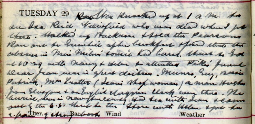 3 Dr Muir appears to have the name wrong again: he had been attending Elizabeth Mill (1872-1954) who lived with her brother John Spottiswoode Mill at Greenhill, Ashkirk, see 26 November 1921 diary entry for full details
