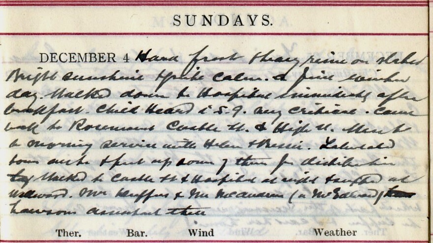 Hard frost + heavy rime on slates. Bright sunshine + quite calm. A fine winter day. Walked down to Hospital immediately after breakfast. Child Heard1 i.s.q.2 very critical. Came back to Rosemount3, Castle Street + High Street. Went to morning service with Helen4 + Bessie5. Tabulated town accounts + put up some of them for distribution. Walked to Castle Street + Hospital at night + supped at Wellwood6. Mr Duffus7 + Mr McAndrew8 (a McEdward [?]) Lawson’s9 assistant there.