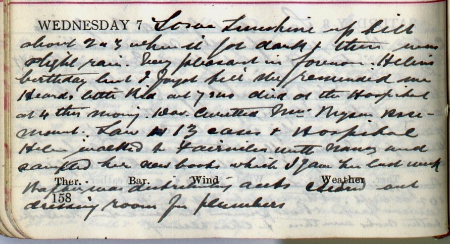 Some sunshine up till about 2 or 3 when it got dark + there was slight rain. Very pleasant in forenoon. Helen’s1 birthday but I forgot till she reminded me. Heard’s little kid aet 7 mo died at the Hospital at 4 this morning2. Dav.3 curretted Mrs Bryson, Rosemount4. Saw 13 cases + Hospital. Helen walked to Fairnilea5 with Nancy6 and sampled her new boots which I gave her last week7. Baptie8 was distributing accounts. Cleared out dressing room for plumbers9.