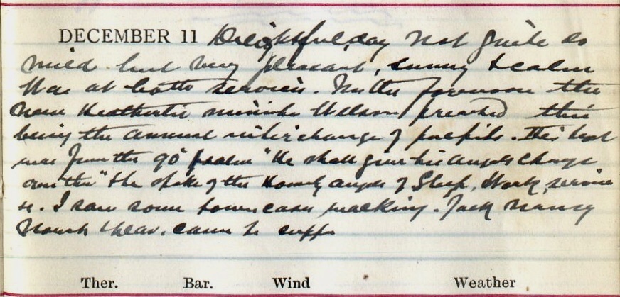 Delightful day not quite so mild but very pleasant, sunny + calm. Was at both services. In the forenoon the new Heatherlie minister Wilson1 preached this being the annual interchange of pulpits. His text was from 90th Psalm “He shall give his angels charge over thee”2 + “He spoke of the Heavenly angels of Sleep, Work, service +c3. I saw some town cases walking. Jack, Nancy4, Norah + Dav.5 came to supper.