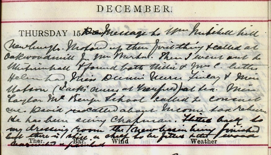 Message to William Mitchellhill1, Newburgh2. Motored up there first thing + called at Oakwoodmill for Mrs Barton3. Then I went out to Whitmuirhall + found Willie + Mrs C4 better. Helen5 had Miss Dunn6, Nurse Finlay7 + Miss Watson8 (Jack’s nurse at Viewfield9) for tea. Miss Taylor10, Mountbenger School called to consult me. David11 called about Income Tax return. He has been seeing Chapman12. Flitted back to my dressing room the new basin being finished but there is still a shelf to be fitted + that wood varnished + painted.