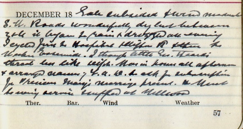 Gale subsided + wind moderated. S.W. Roads wonderfully dry but between 3 + 4 it began to rain + drizzled all evening. I cycled first to Hospital + Clifton Road + then to Wester Essenside1. I thought little Geo. Heard’s2 throat less like Diph.3 Was in house all afternoon + arranged names of V.A.D.4 to ask for subscription for Princess Mary’s marriage present5. Went to evening service + supped at Wellwood6.