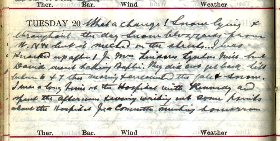 What a change! Snow lying + throughout the day snow blizzards from W.N.W. but it melted on the streets. I was knocked up after 1 for Mrs Lindores1, Synton Mill but David2 went taking Baptie3. They did not get back till between 6 + 7 this morning + encountered the gale + snow. I was a long time at the Hospital with Kennedy4 and spent the afternoon + evening writing out some points about the Hospital for a Committee meeting tomorrow.