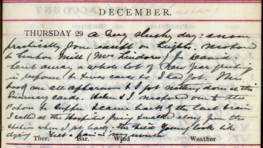 A very slushy day: snow practically gone except on heights. Motored to Sinton Mill (Mrs Lindores1) for David2. Sent away a whole lot of New Year greetings in response to Xmas cards +c I had got. This took me all afternoon + I got nothing done at the Summary cards3. Helen4 + I motored over to the Patons5 to supper + came back by the last train. I called at the Hospital6 going + walked along from the station when I got back. The child Young7 looks like dying. Felt a pain in my uvula8.