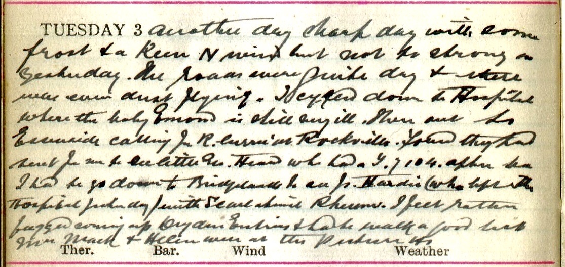 Another dry sharp day with some frost + a keen N wind but not so strong as yesterday. The roads were quite dry + there was even dust flying. I cycled down to Hospital where the baby Emond1 is very ill. Then out to Essenside2 calling for R Currie3 at Rockville. Found they had sent for me to see little George Heard4 who had a T. of 104. after tea. I had to go down to Bridgelands to see Js. Hardie5 (who left the Hospital yesterday) with Scarletina Rheum6. I felt rather fagged coming up Dryden’s Entries7 + had to walk a good bit. Mrs Mack + Helen8 were at the picture house.