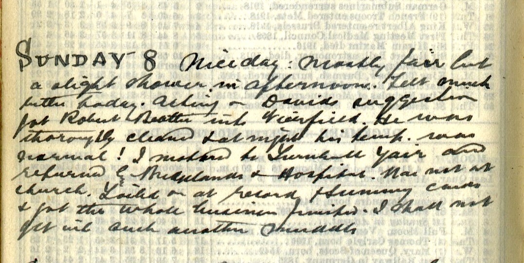 Nice day: mostly fair but a slight shower in afternoon. Felt much better today. Acting on David’s1 suggestion got Robert Beattie2 into Viewfield. He was thoroughly cleaned + at night his temp. was normal! I motored Turnbull, Yair3 and returned by Bridgelands + Hospital4. Was not at church. Toiled at record + Summary cards + got the whole business finished5. I shall not get into such another muddle.