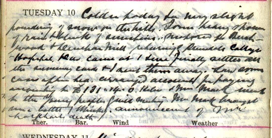 Colder today + a very slight powdering of snow on the hills. Some heavy showers of rain + blinks of sunshine. Motored to Beechwood + Deuchar Mill returning by Dunsdale Cottage [and] Hospital. Dav.1 came at 1 + we finally settled all the summary cards2 + I sent them away. Saw some cases after + arranged accounts for paying amounting to £131.14.0. Helen3 + Mrs Mack4 went to the Young People’s Guild Meeting5. Mrs Mack brought me a bottle of whisky. Announcement of Mr [illegible] death6.