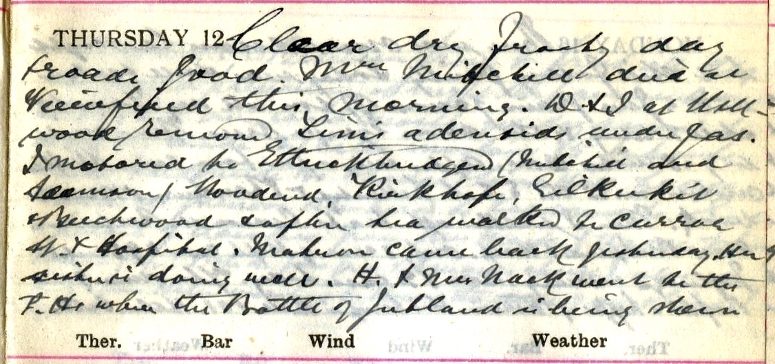 Clear dry frosty day + roads good. Mrs Mitchell1 died at Viewfield this morning. D.2 + I at Wellwood removed Tim’s3 adenoids under gas. I motored to Ettrickbridgend (Mitchell4 + Adamson5), Woodend, Kirkhope, Gilkeekit + Beechwood + after tea walked to Curror Street + Hospital. Matron came back yesterday. Her sister is doing well6. Helen7 + Mrs Mack8 went to the P. H. [Picture House] where the Battle of Jutland is being shown9.