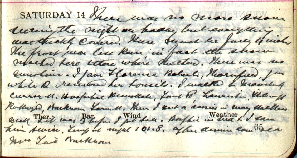 There was no more snow during the night or today but everything was thickly covered. There must be fully 4 inches. The frost was less keen, in fact the snow melted here + there where sheltered. There was no sunshine. I gave Florence Roberts1, Thornfield, gas while D.2 removed her tonsils. Then I cut a drain in Mary Walker’s3 neck + it was 3 before I got tea. Baptie4 in bed + I saw him twice. Temp. at night 101.8. After dinner saw old Mrs Tait, Backrow5.