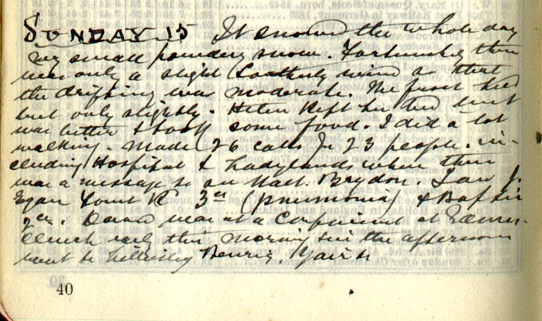 It snowed the whole day very small powdery snow. Fortunately there was only a slight (Southerly) wind so that the drifting was moderate. The frost held but only slightly. Helen1 kept her bed but was better + took some food. I did a lot walking. Made 26 calls for 23 people including Hospital + Ladylands2 where there was a message to see Walt. Brydon3. Saw Jo. Egan4, Forest Road, 3? (pneumonia) + Baptie 2? 5 6. David7 was at a Confinement at Gamescleuch8 early this morning + in the afternoon went to Lilliesleaf, Benrig9, Yair +c.