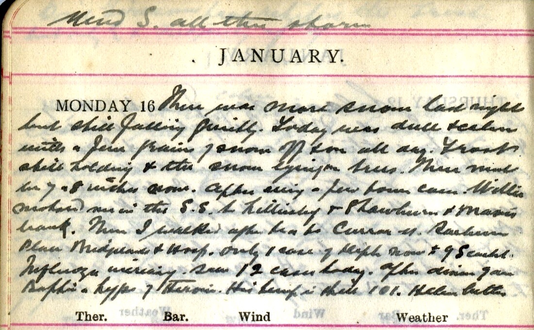 There was more snow last night but still falling quietly. Today was dull + calm with a few grains of snow off + on all day. Frost still holding + the snow lying on trees. There must be 7 or 8 inches now. After seeing a few town cases Willie1 motored me in the S.S.2 to Lilliesleaf + Shawburn + Mavisbank. Then I walked after tea to Curror Street, Raeburn Place, Bridgelands + Hosp. Only 1 case of Diph. now + 9 Scarlet. Influenza increasing, saw 12 cases today3. After dinner gave Baptie4 a hypo of Heroin. His temp. is still 101. Helen better5.