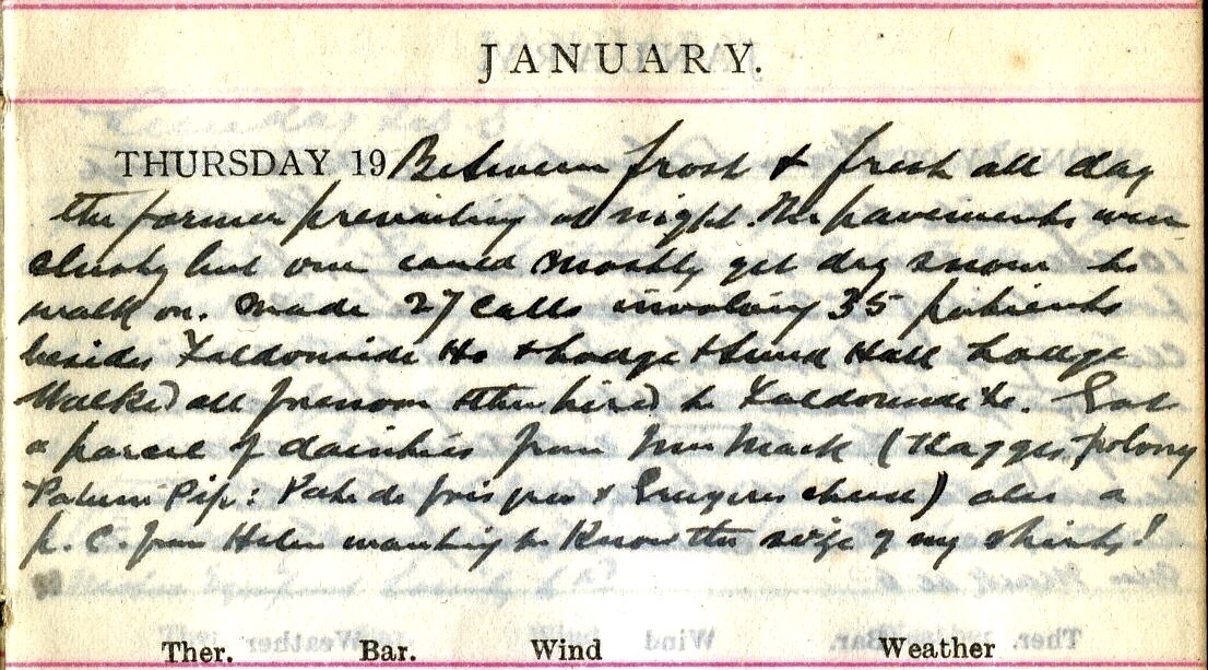 Between frost + fresh all day the former prevailing at night. The pavements were slushy but one could mostly get dry snow to walk on. Made 27 calls involving 35 patients besides Faldonside Ho. + Lodge + Sund. Hall Lodge. Walked all forenoon + then hired to Faldonside +c. Got a parcel of dainties from Mrs Mack1 (Stagges [?] Polony, Pat. Pip.: Pate de fois gras + Gruyere cheese) also a P.C. [postcard] from Helen3 wanting to know the size of my shirts!